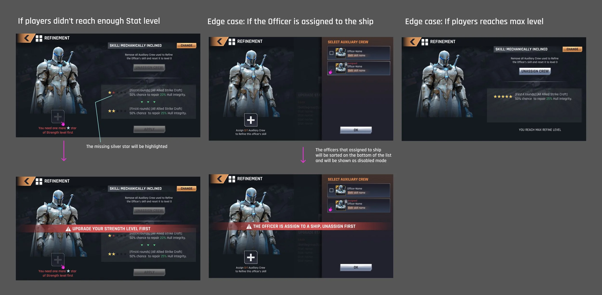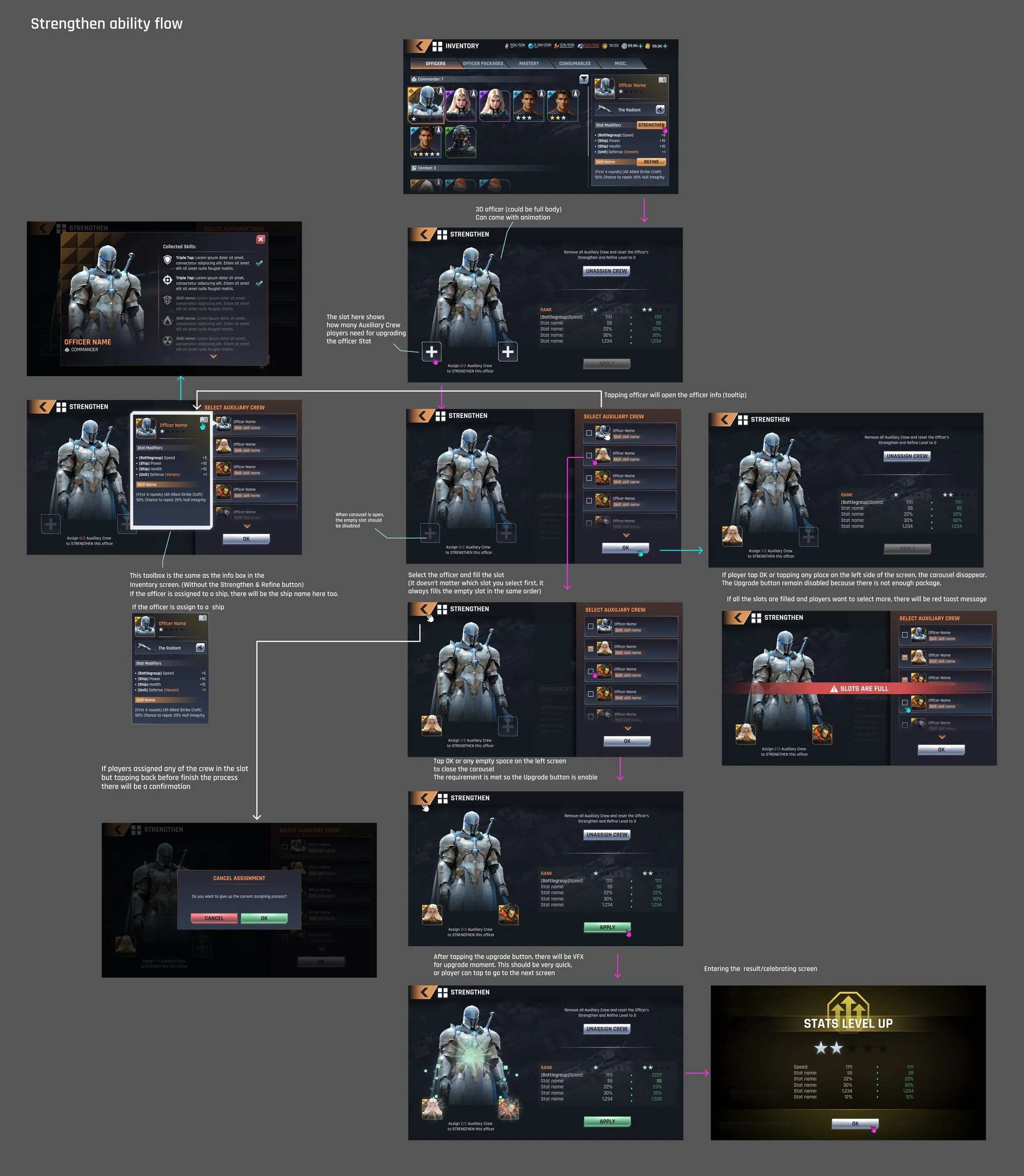 High-fidelity wireframes: The following images display the high-fidelity wireframes and user flow of the Strengthen Ability feature, accompanied by a detailed list of potential edge cases.